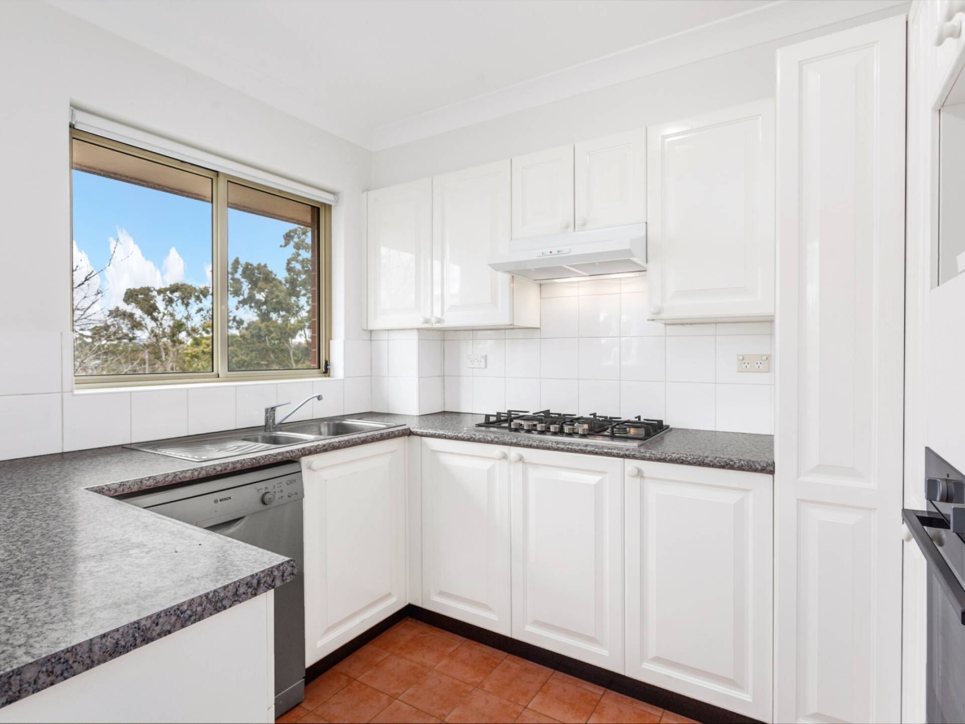 Bright kitchen with generous cupboards, gas cooking and stainless appliances