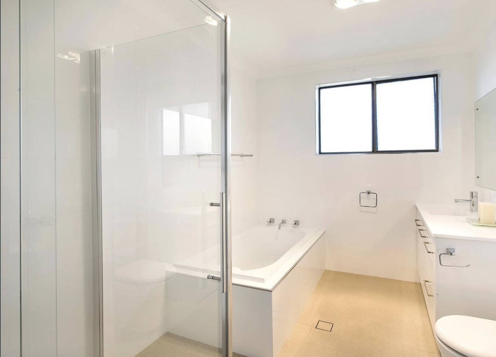Large modern bathroom with separate bath and shower