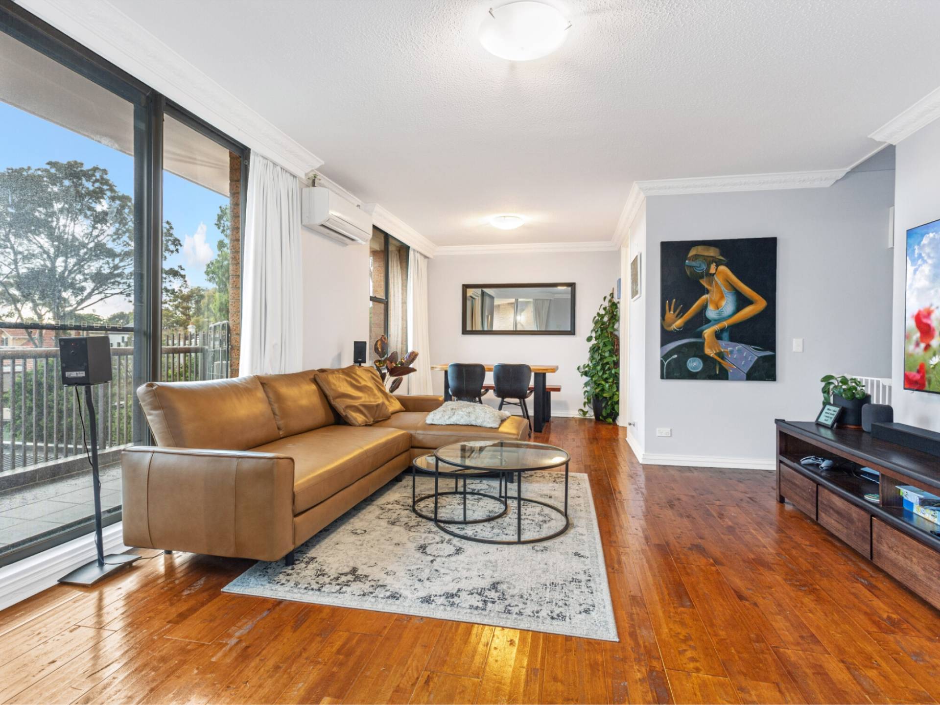 Quiet living and dining with adjoining balcony set at the rear of the building.