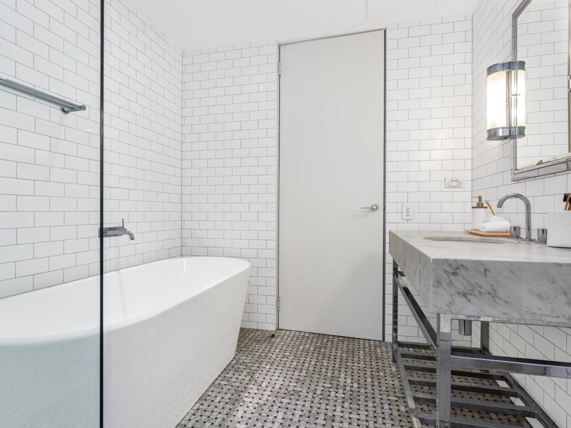Marble mosaic bathrooms, main with freestanding bath