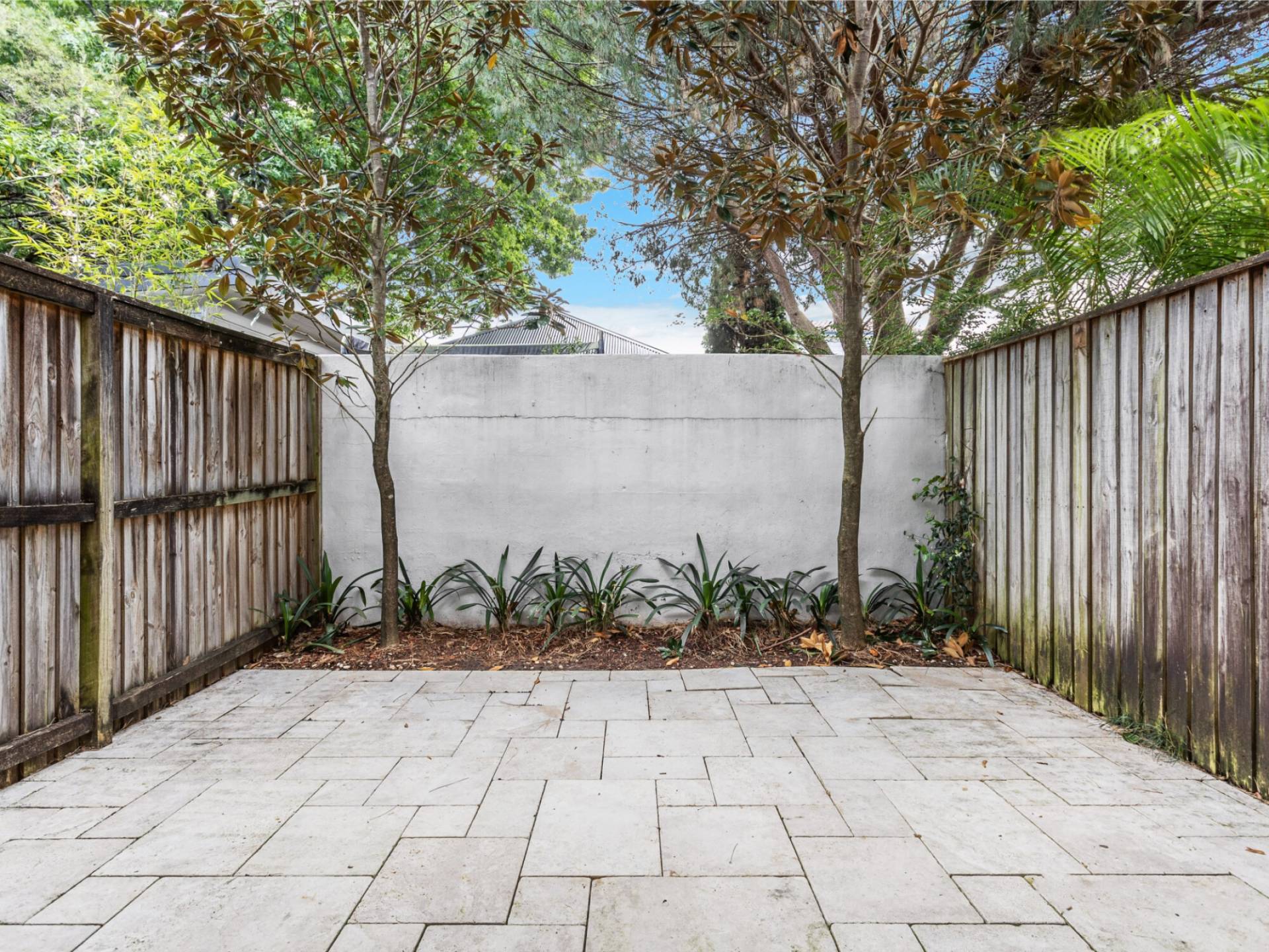 Tri level open plan living flows to paved courtyard