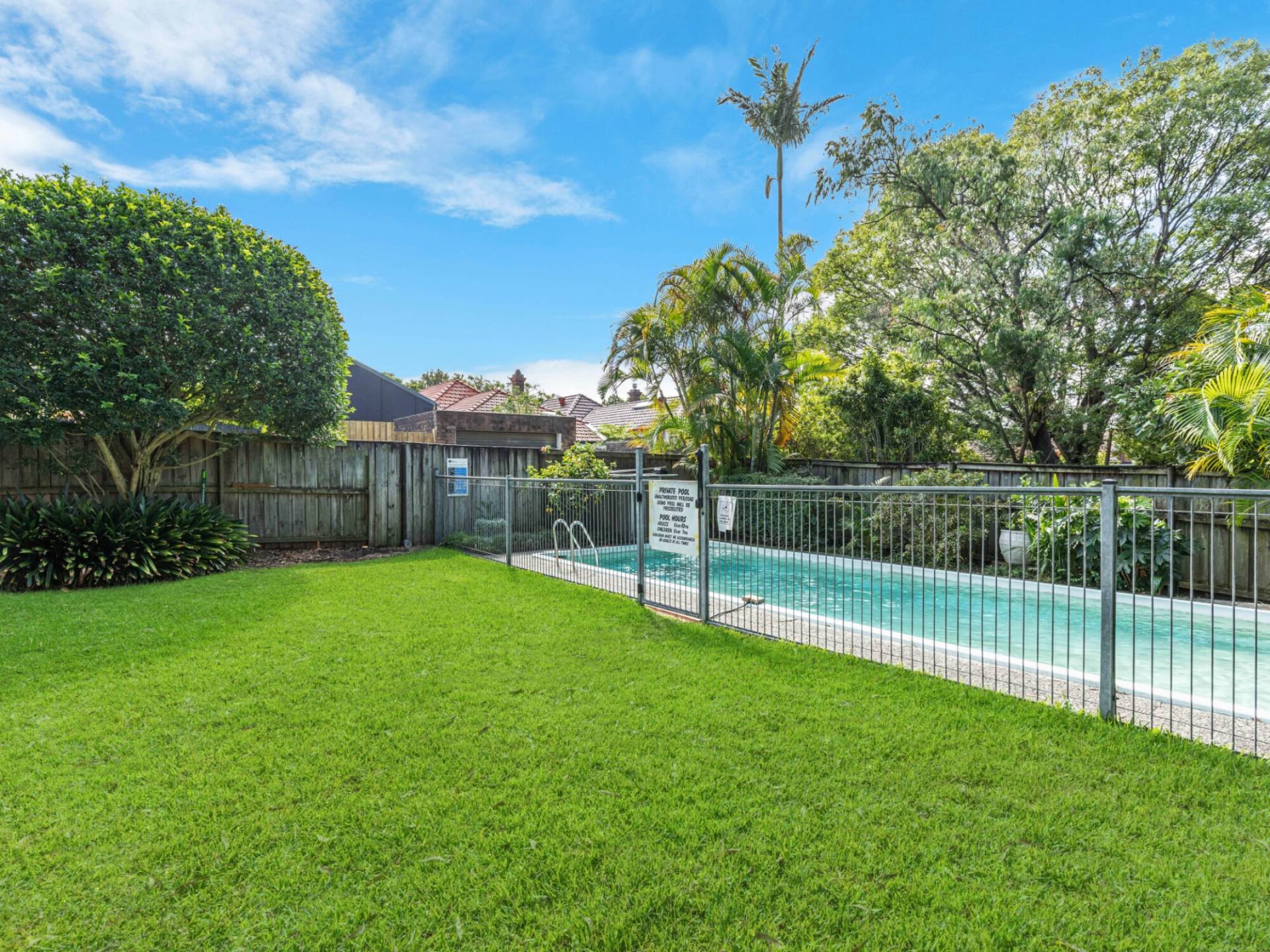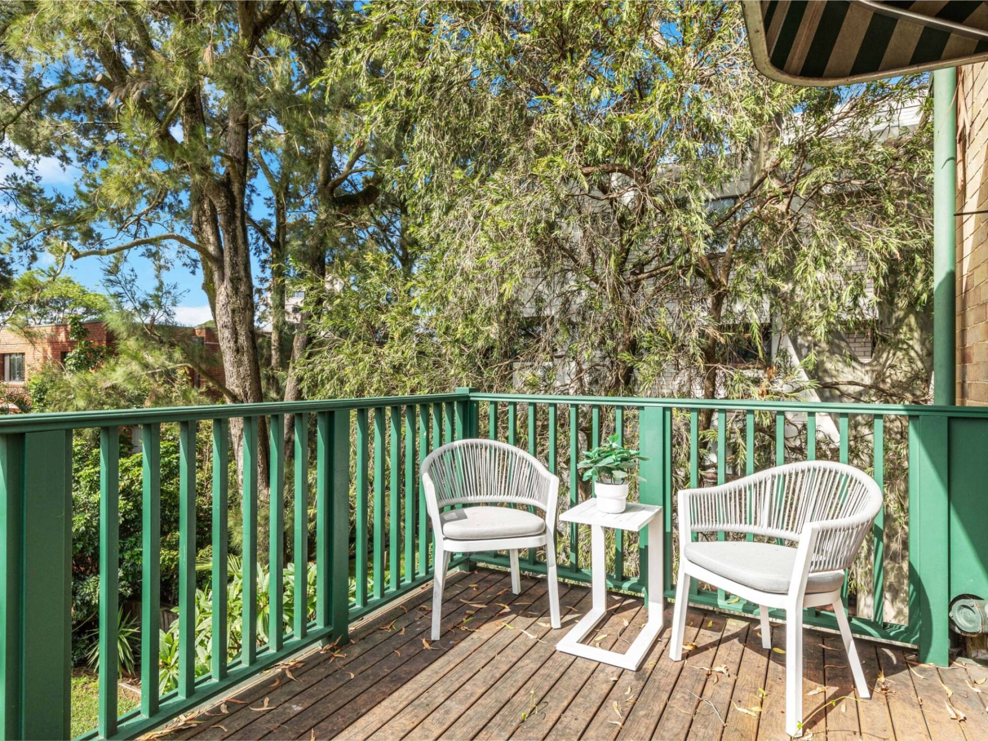 Sunny north facing balcony overlooks communal gardens and swimming pool