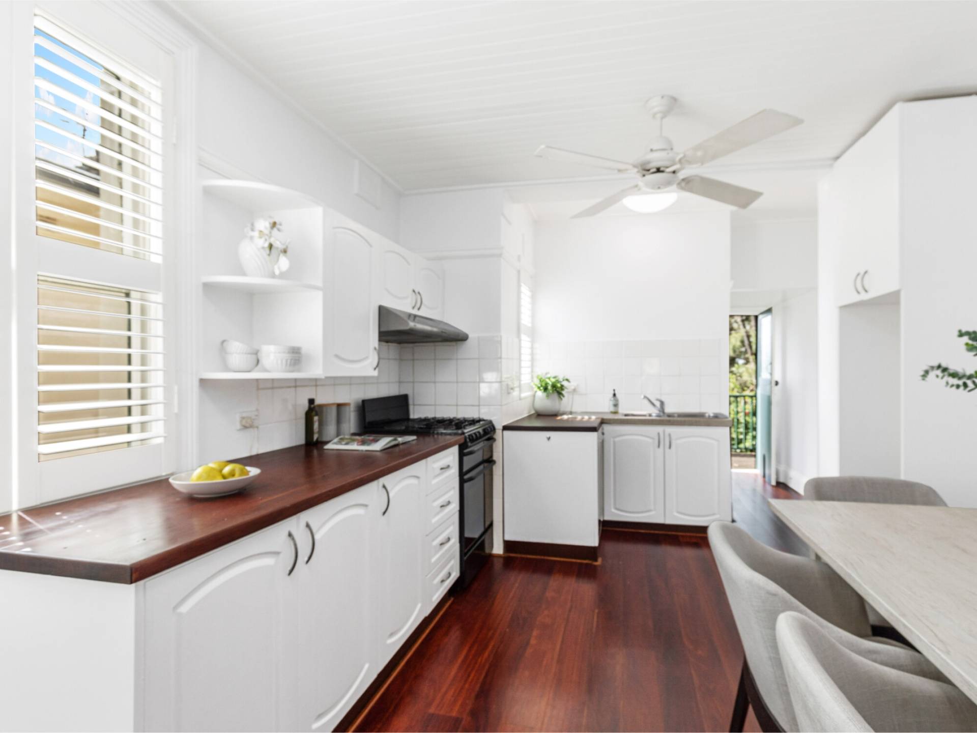 Spacious Open plan kitchen with lovely timber bench tops adjoins dining