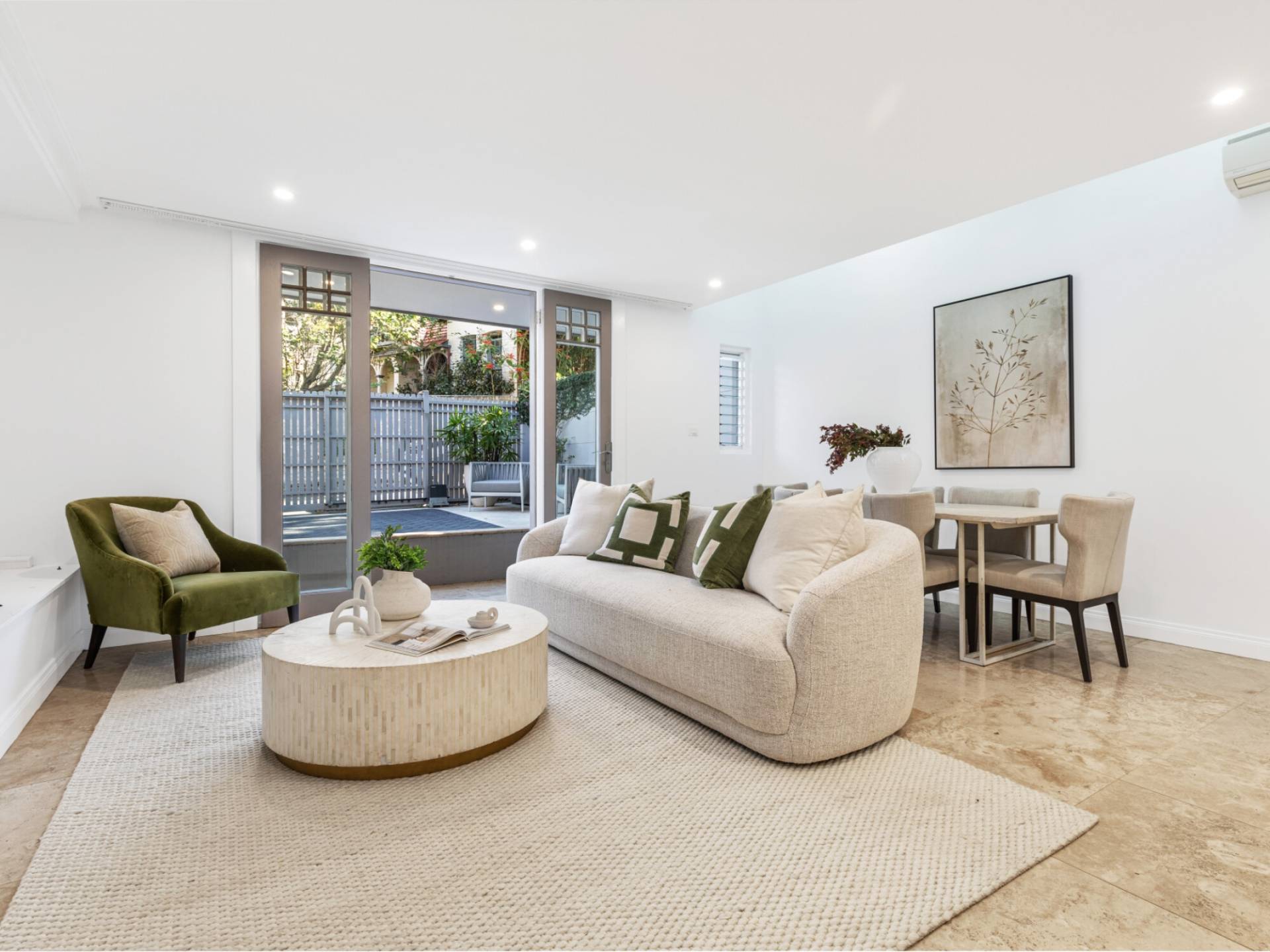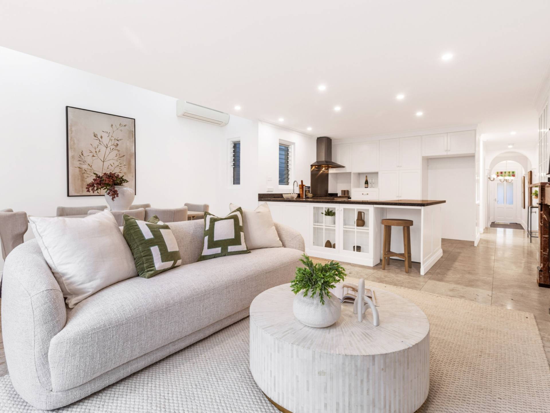 Travertine and timber flooring throughout