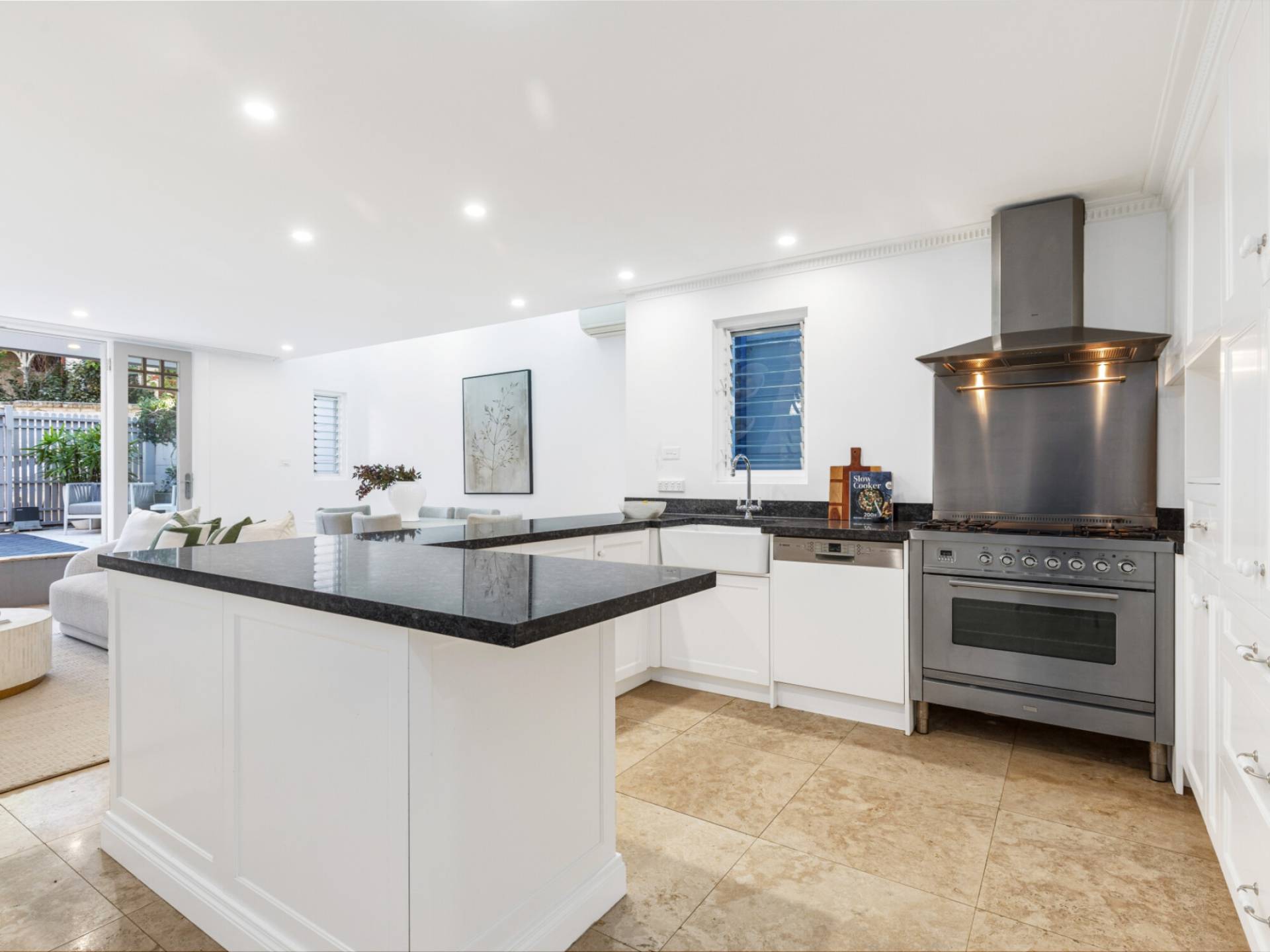 Large adjacent stone kitchen with vast storage and benchspace