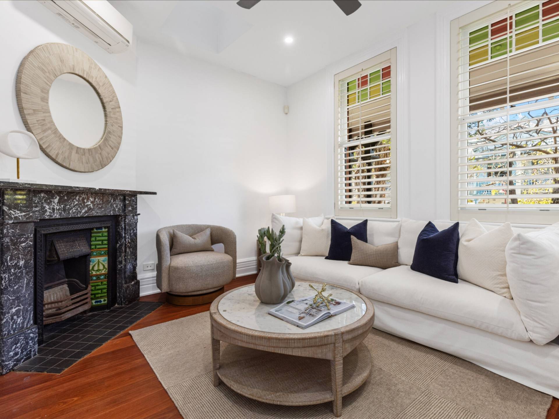 High ceilings, ornate marble fireplaces, air conditioning