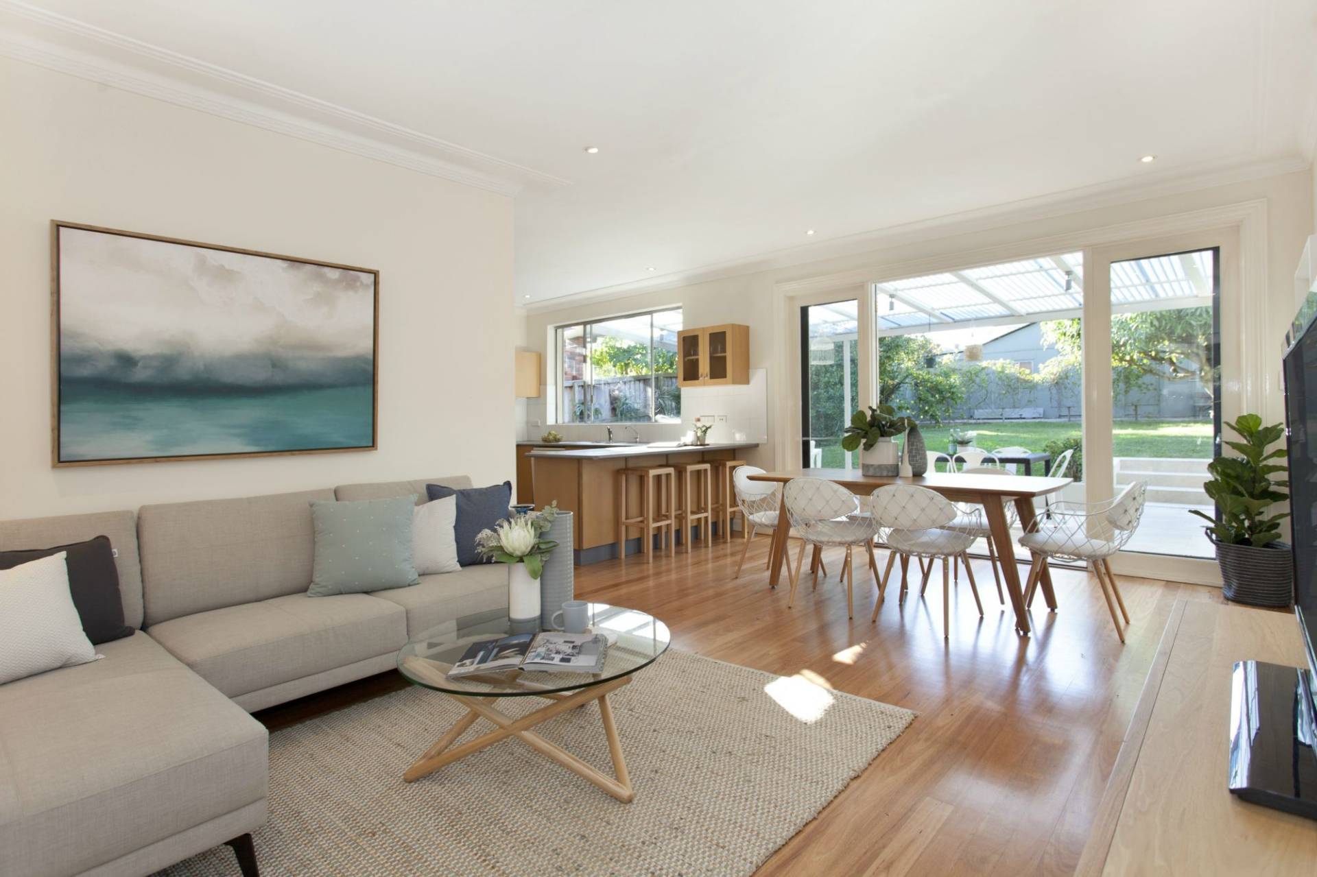 Open plan kitchen with adjacent casual living and dining