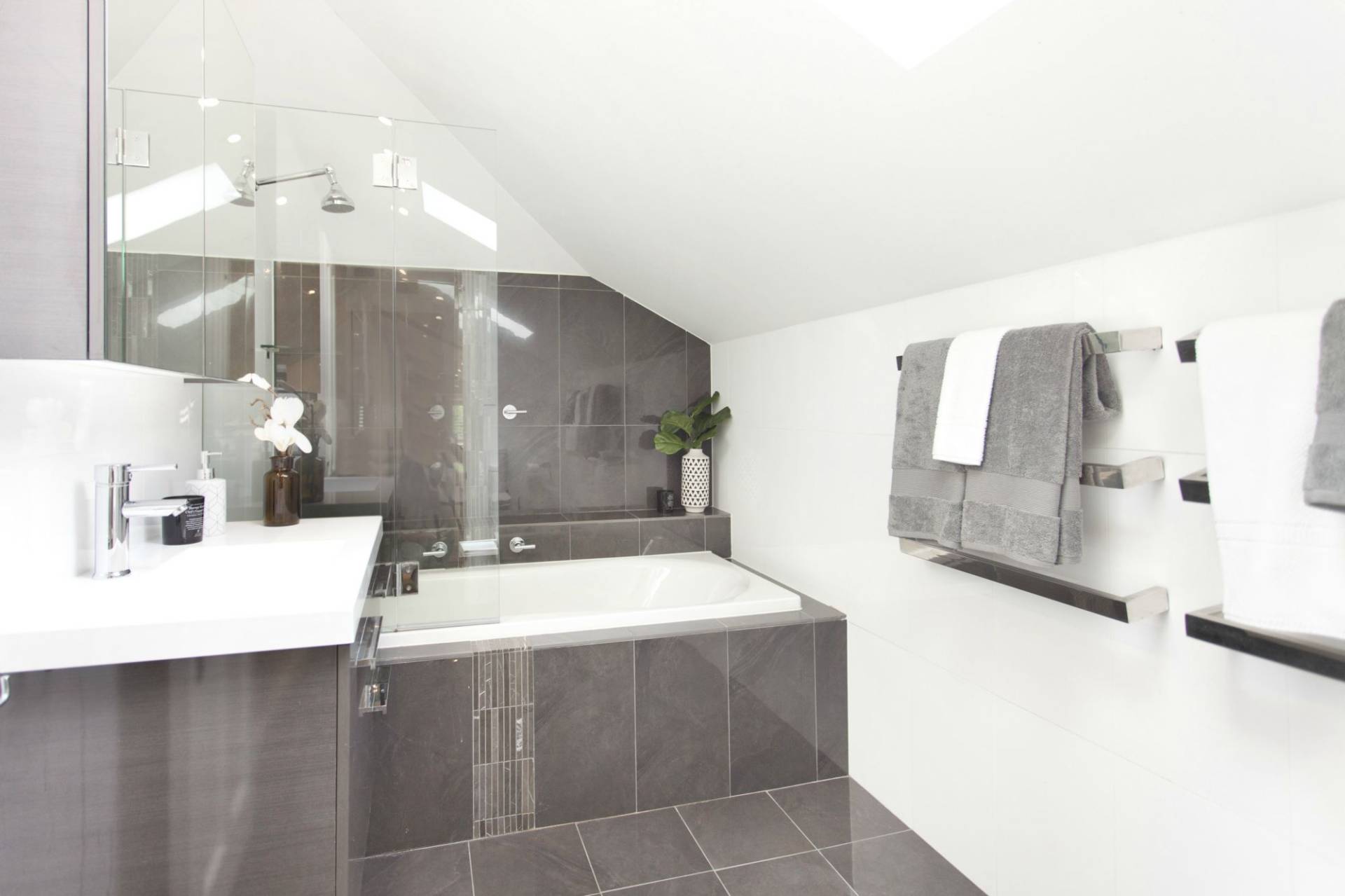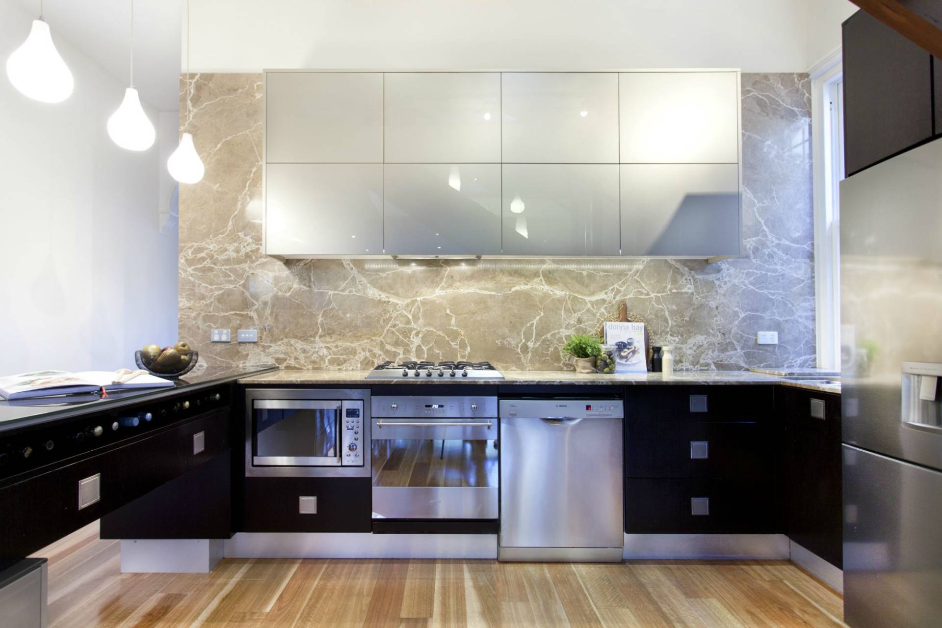Designer marble and glass benchtop kitchen; large immaculate bathroom