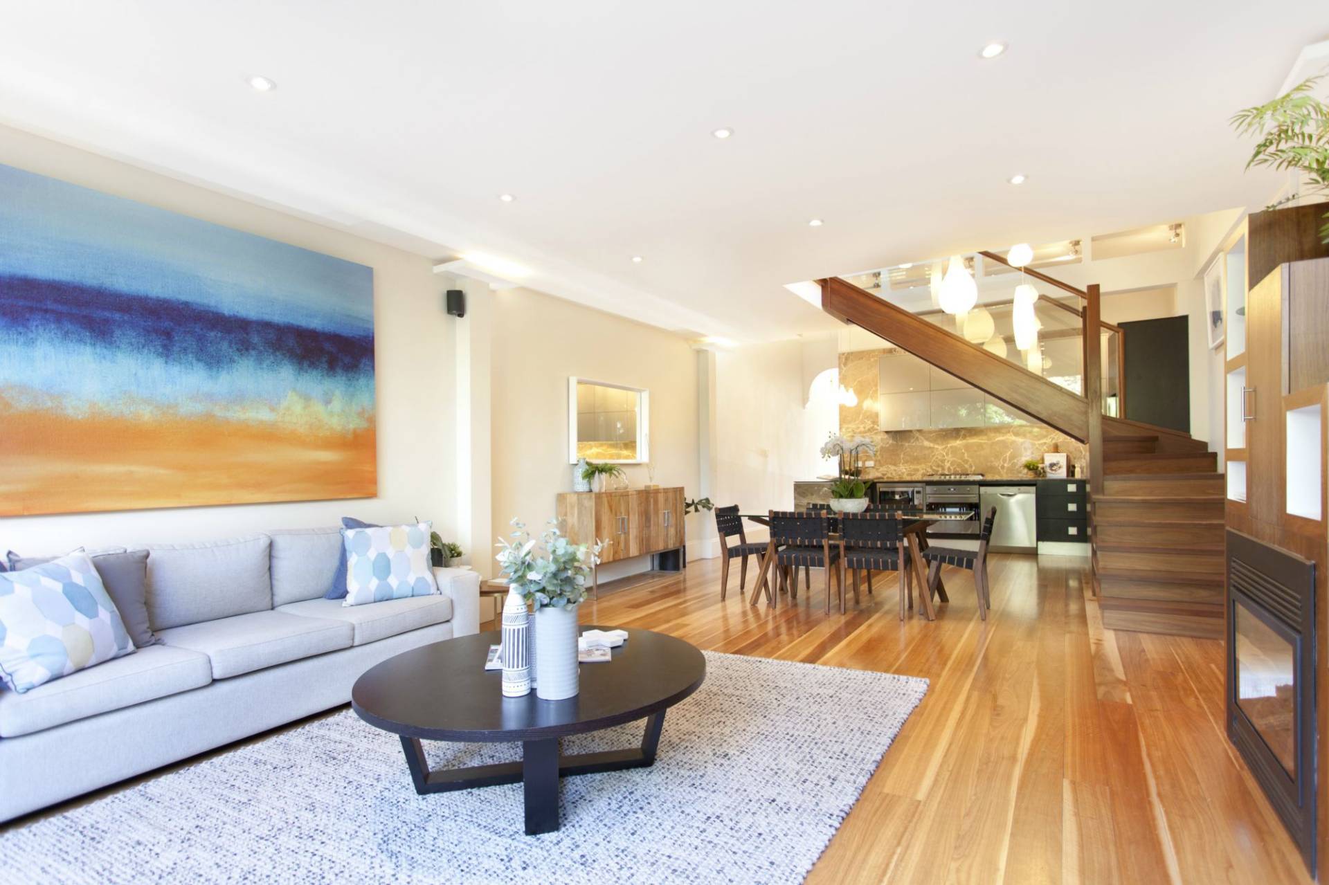 Spacious open plan dining & living with an open fire place, flowing onto a level