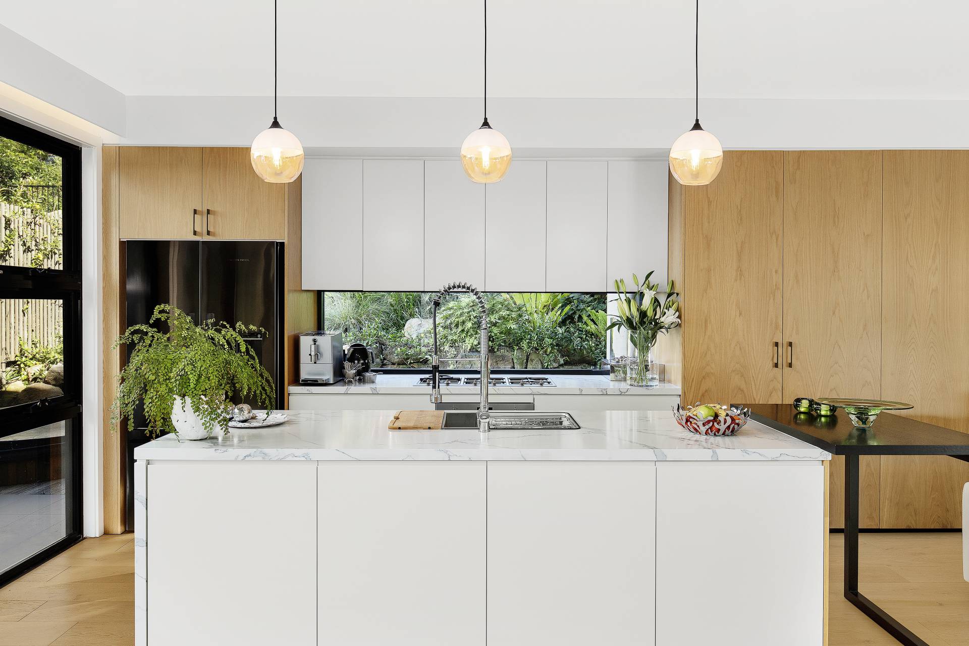 Sleek gas kitchen boasting Smeg appliances including integrated dishwasher