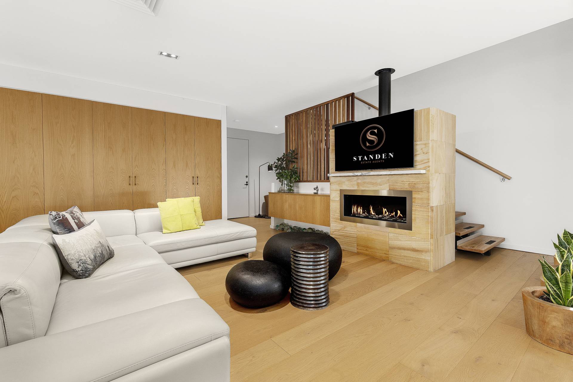 Open plan family living featuring wide hardwood floors & sandstone gas fireplace