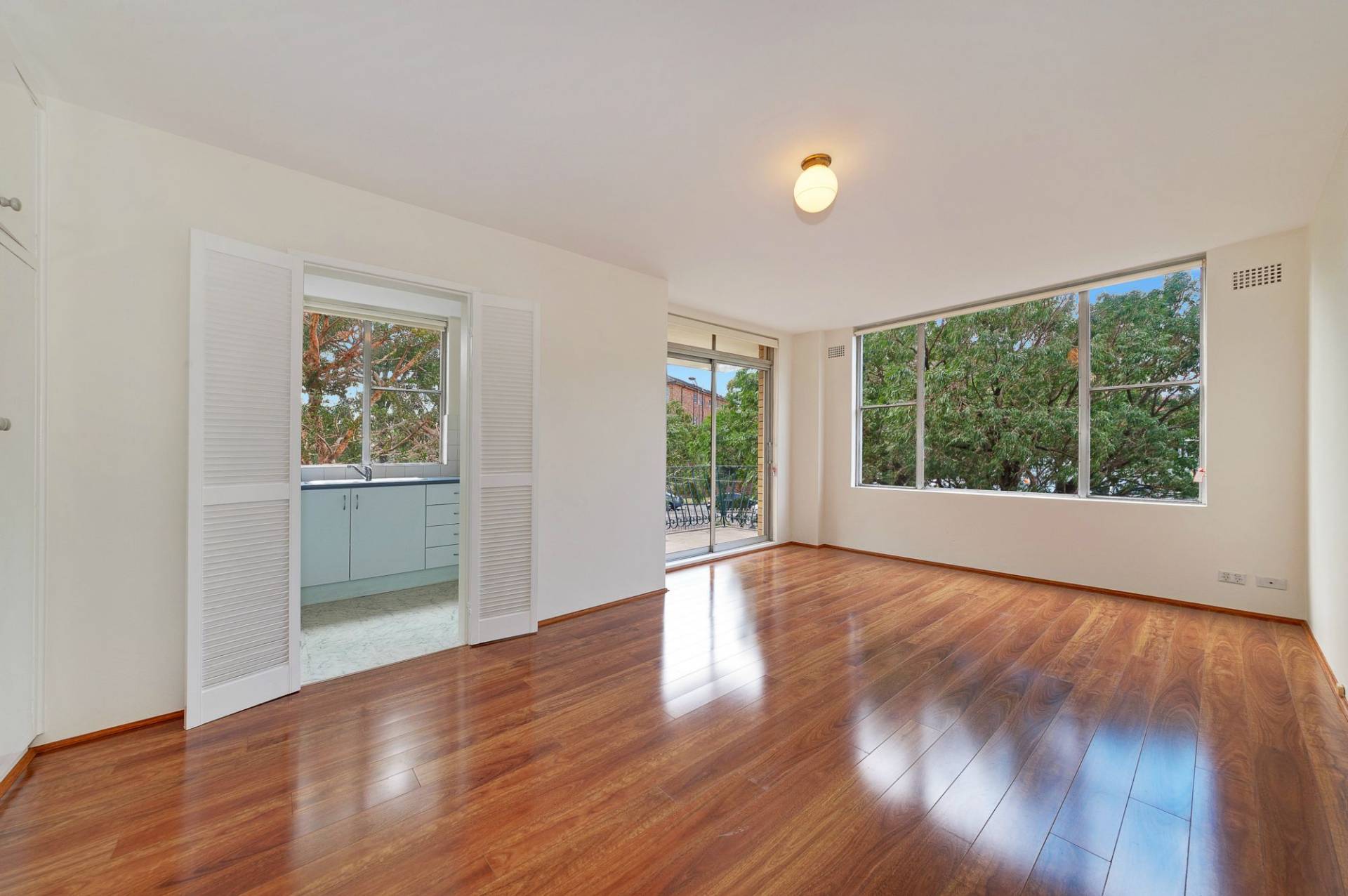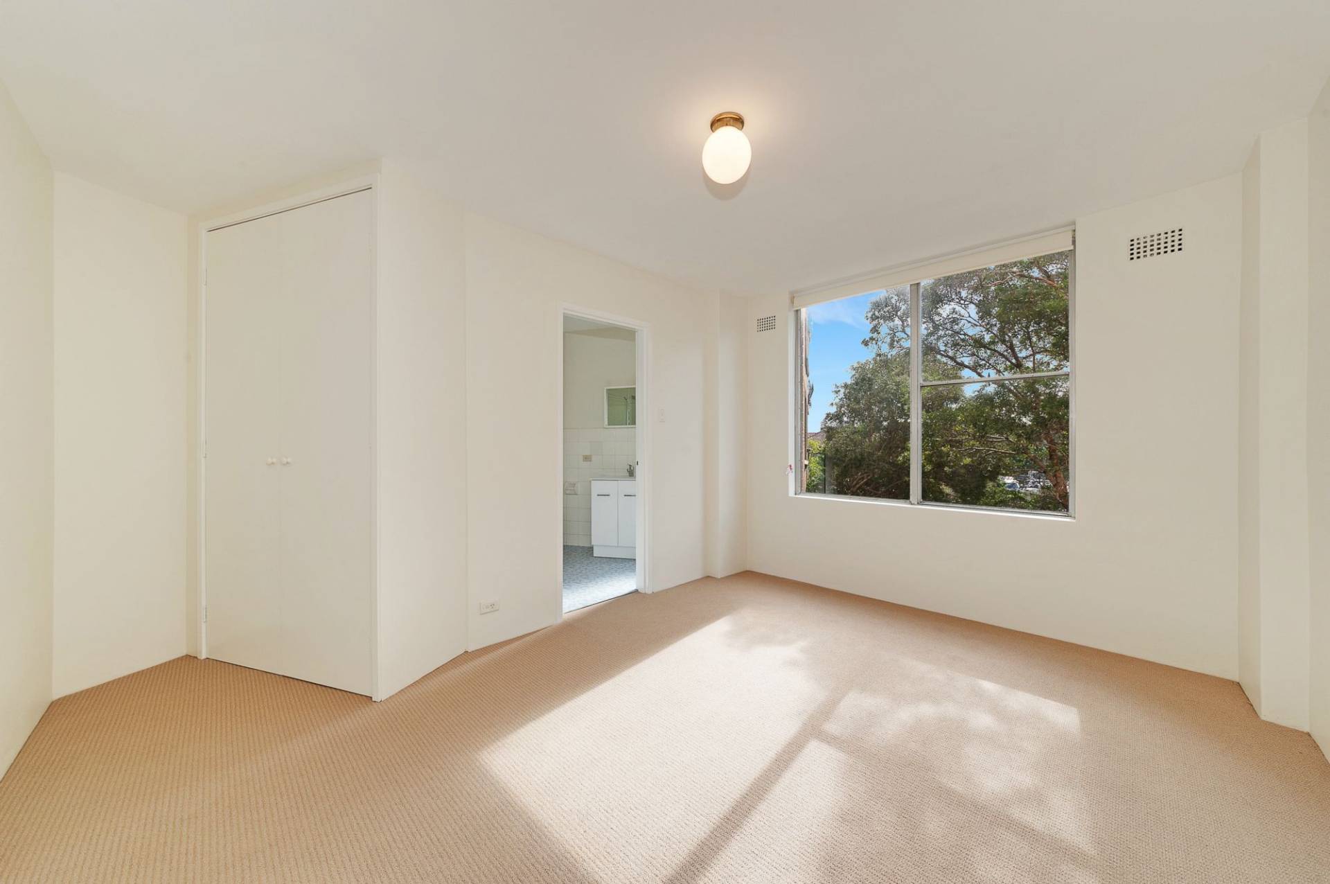 Large bedroom with storage and ensuite bathroom, combined dining/lounge opening to balcony, ample natural light. Modern kitchen.
