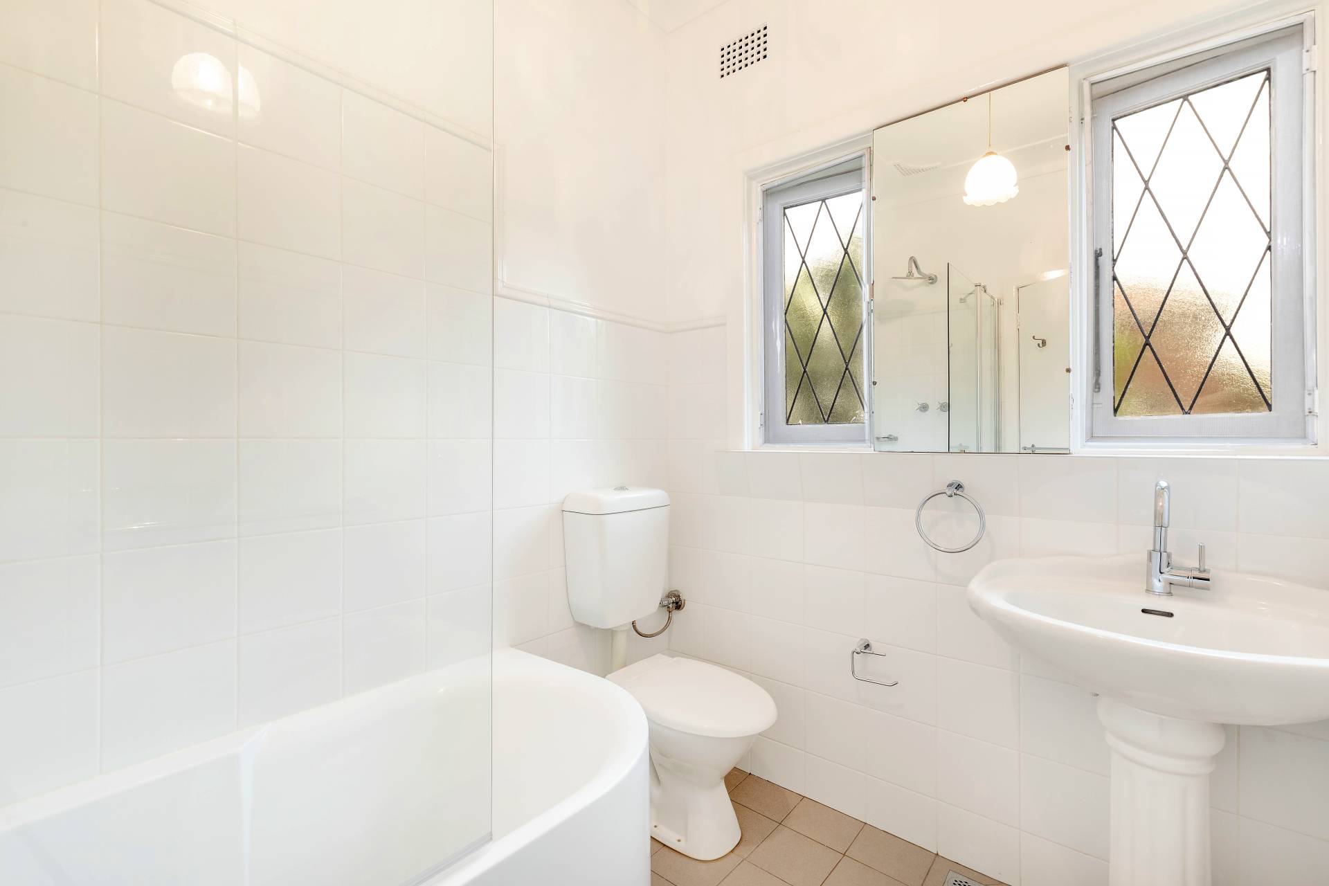• Stylish bathroom in Art Deco style including bath and gorgeous leadlight windows